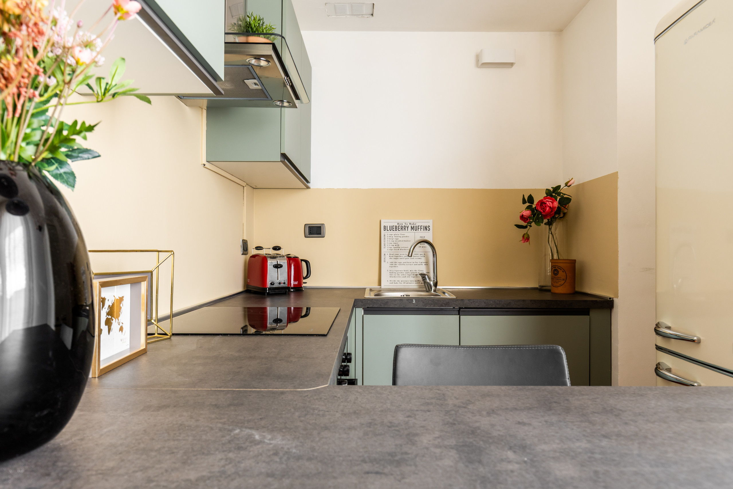 La cucina indipendente, a induzione, è attrezzata con frigorifero, microonde, forno, congelatore, lavastoviglie, stoviglie/posate, utensili da cucina, caffettiera e bollitore.