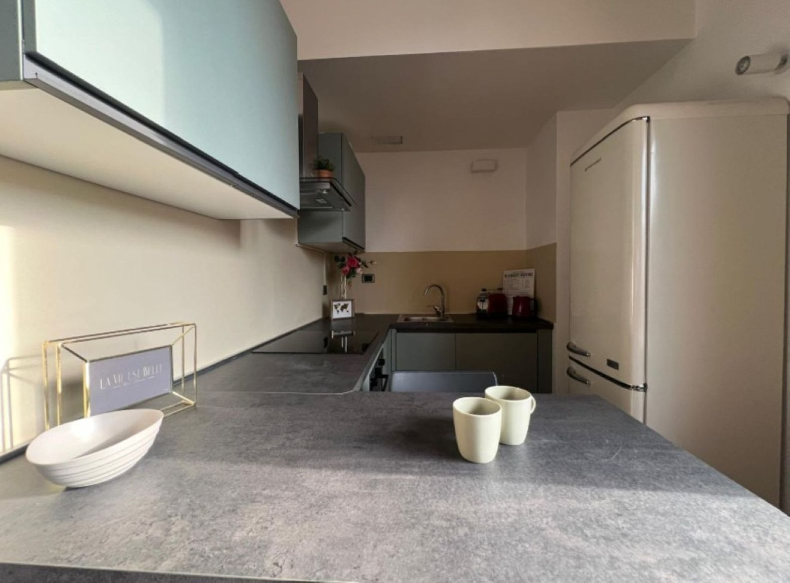 The bright living room is furnished with a sofa that can be converted into a double bed, a table with 4 chairs and a TV. The open kitchen is modern and equipped with a dishwasher, induction hobs and all the utensils for having lunch or dinner for 4 people. The modern furnishings, together with the large windows and the high ceilings typical of period buildings create a unique and refined environment. The bedroom with double bed, TV, wardrobe, also has a small desk where you can work from home in a separate room from the living area. The recently renovated bathroom has a window and it is equipped with a shower cubicle, washing machine and bathroom fixtures.