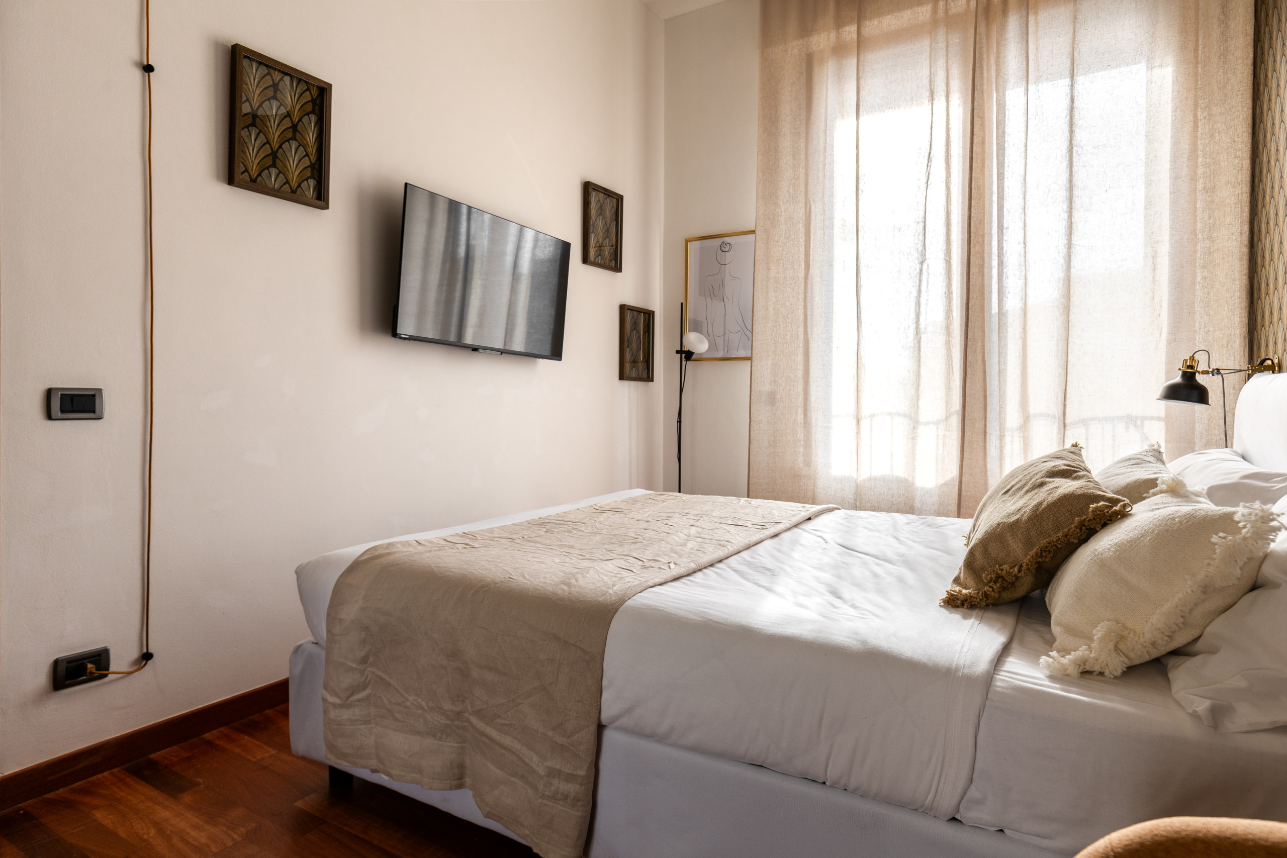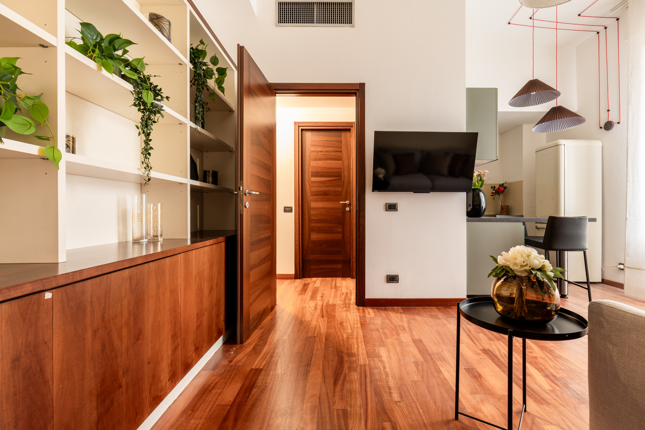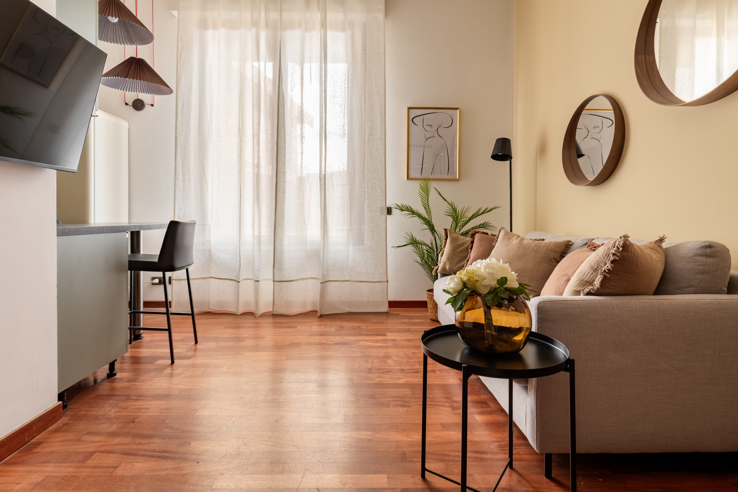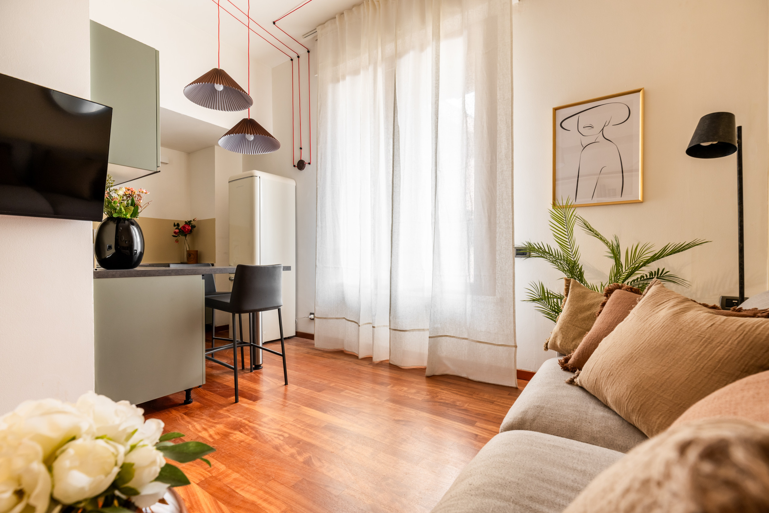 The bright living room is furnished with a sofa that can be converted into a double bed, a table with 4 chairs and a TV. The open kitchen is modern and equipped with a dishwasher, induction hobs and all the utensils for having lunch or dinner for 4 people. The modern furnishings, together with the large windows and the high ceilings typical of period buildings create a unique and refined environment. The bedroom with double bed, TV, wardrobe, also has a small desk where you can work from home in a separate room from the living area. The recently renovated bathroom has a window and it is equipped with a shower cubicle, washing machine and bathroom fixtures.