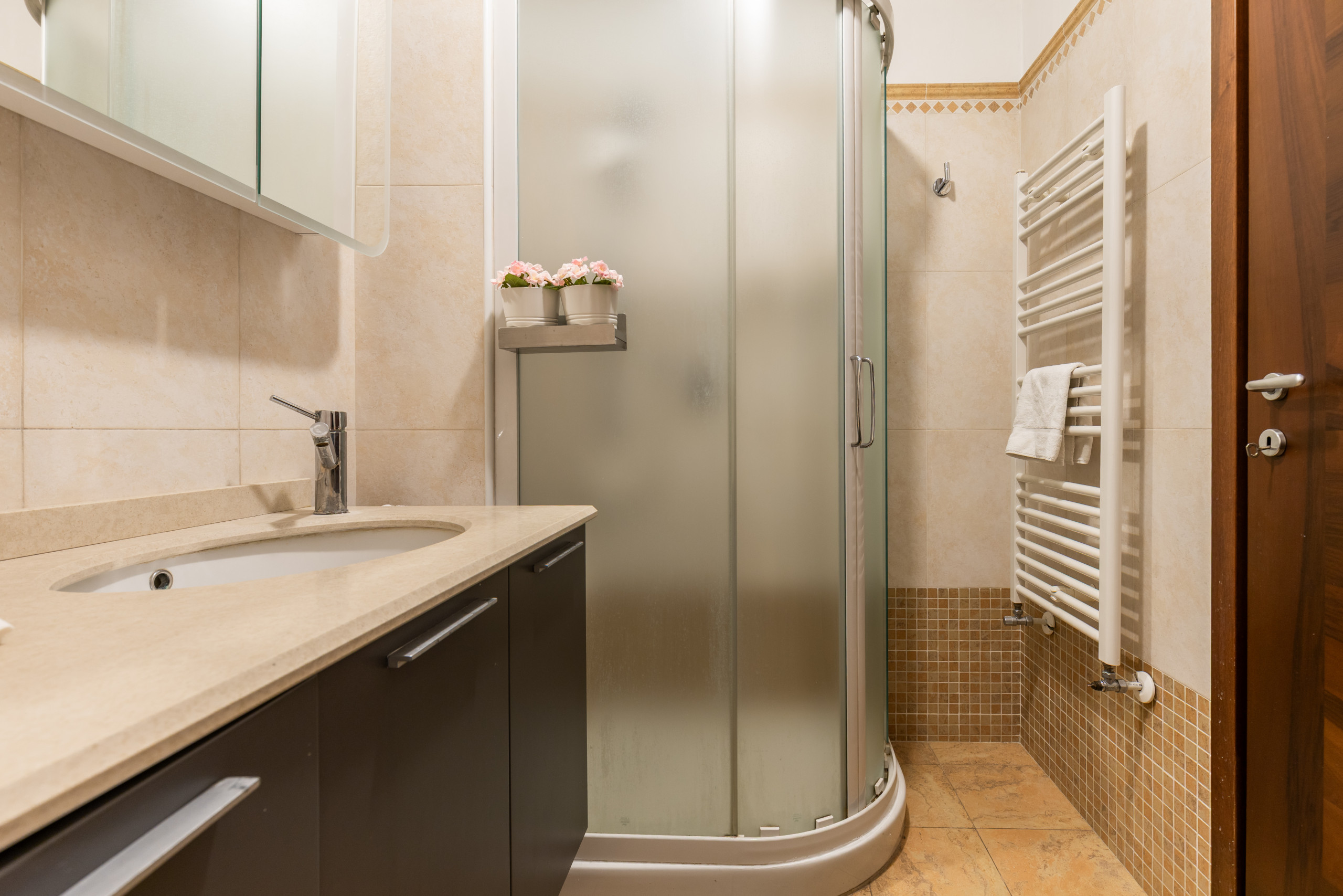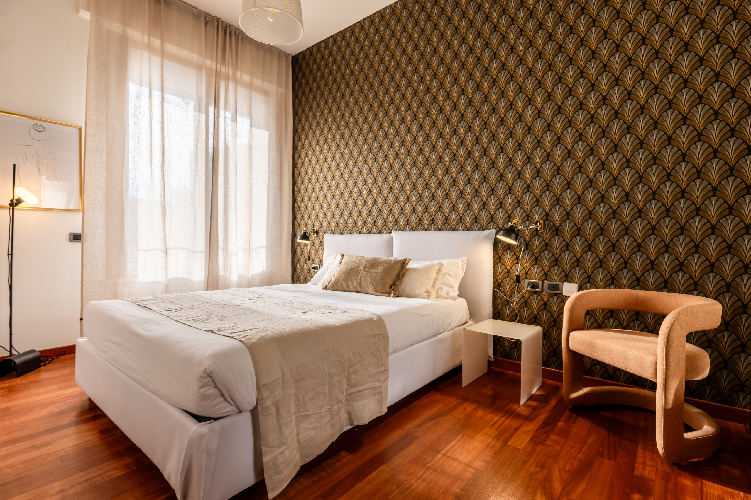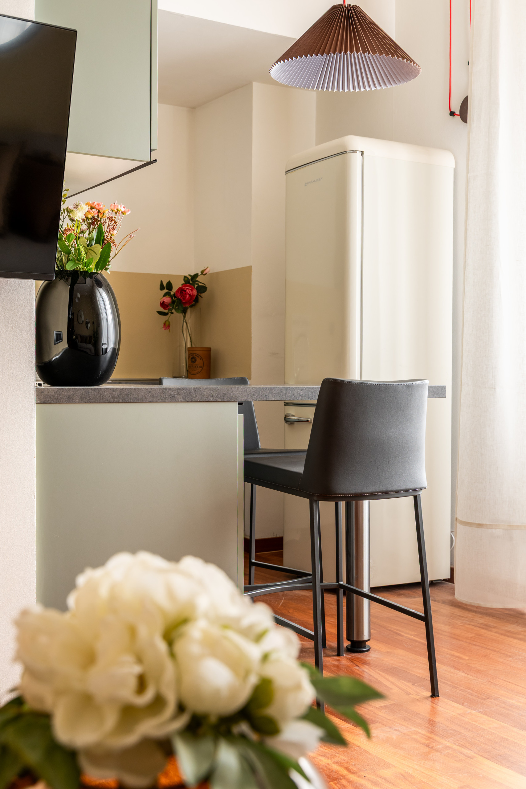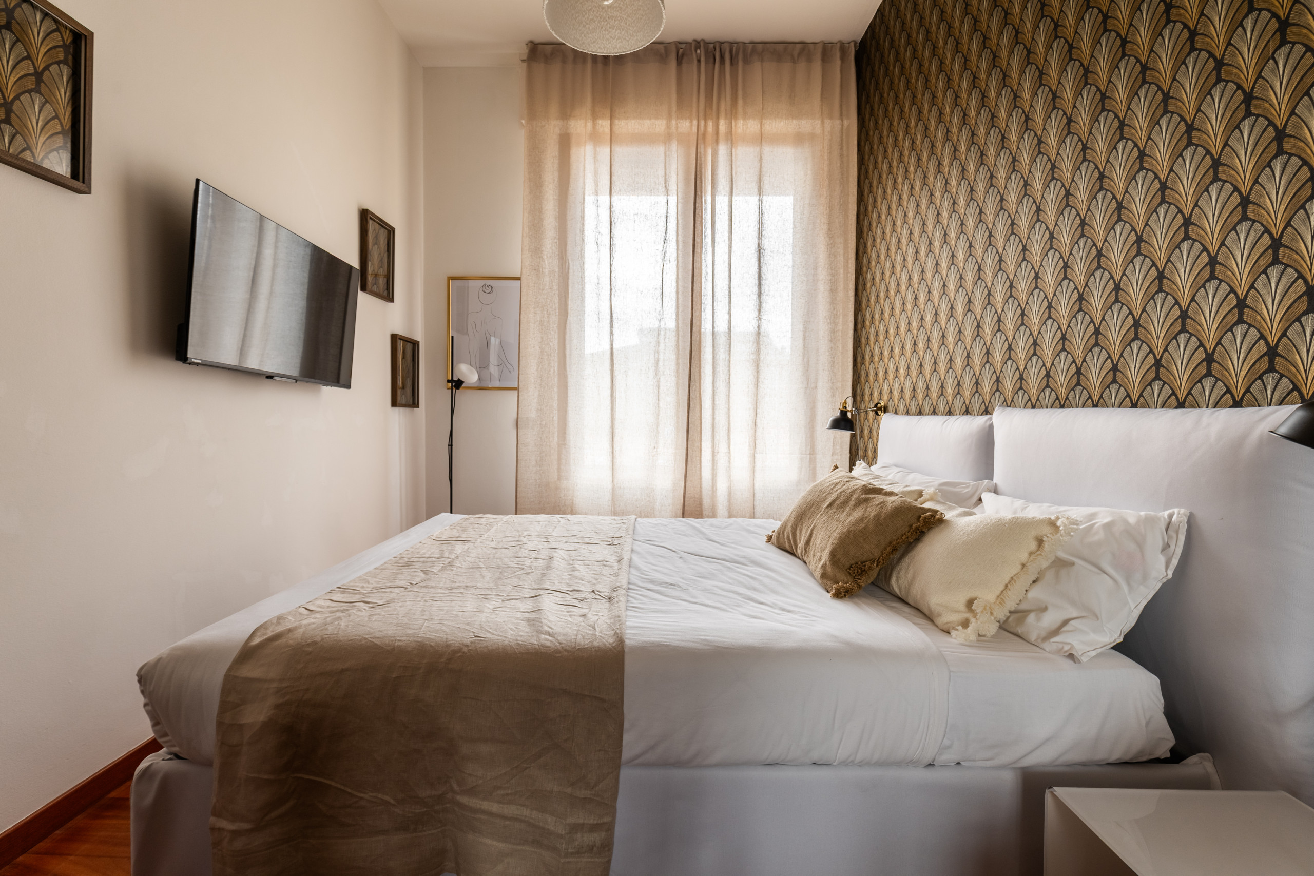 The bright living room is furnished with a sofa that can be converted into a double bed, a table with 4 chairs and a TV. The open kitchen is modern and equipped with a dishwasher, induction hobs and all the utensils for having lunch or dinner for 4 people. The modern furnishings, together with the large windows and the high ceilings typical of period buildings create a unique and refined environment. The bedroom with double bed, TV, wardrobe, also has a small desk where you can work from home in a separate room from the living area. The recently renovated bathroom has a window and it is equipped with a shower cubicle, washing machine and bathroom fixtures.