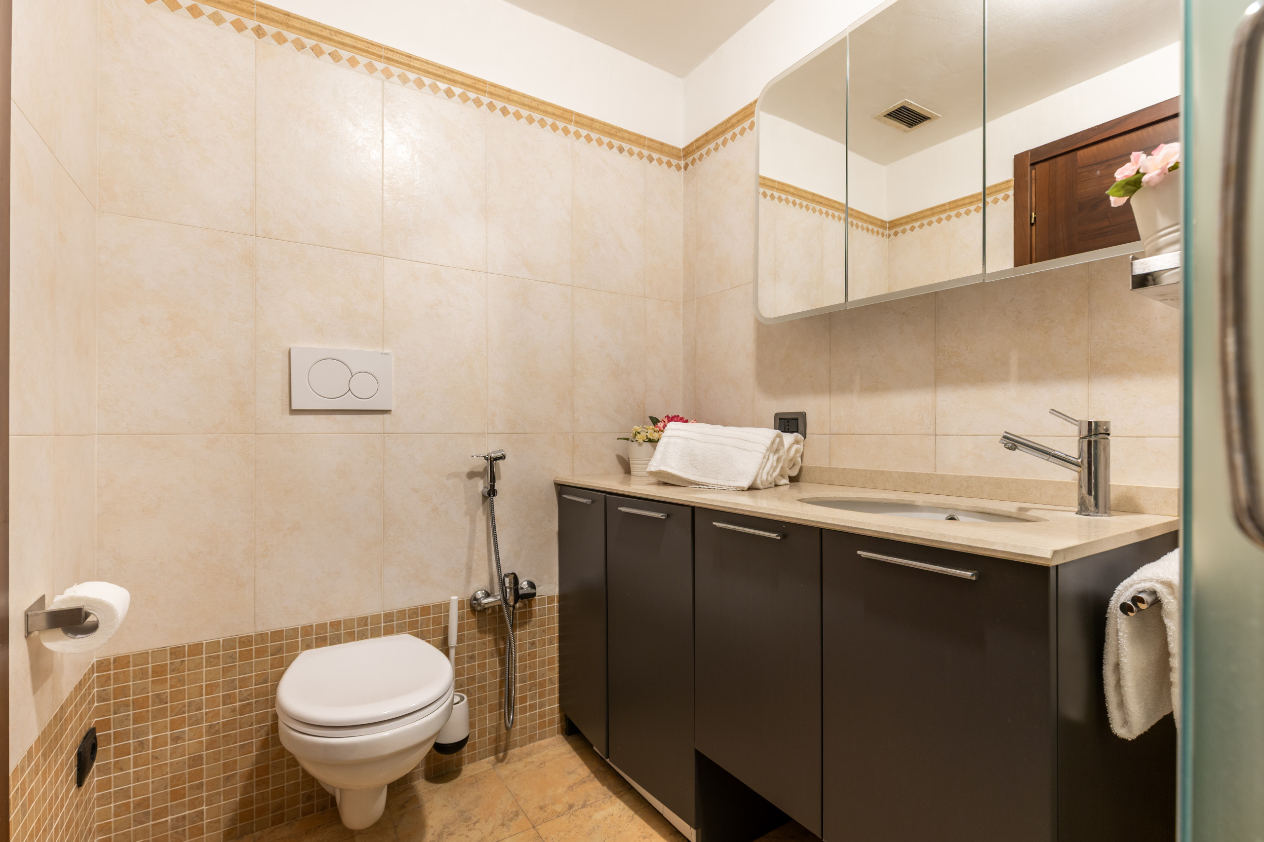 The living area consists of an open kitchen, equipped with crockery and utensils for lunch or dinner comfortably for 4 people, a table extractable, a sofa convertible into a comfortable double bed for 2 people. There is then a bedroom with double bed, wardrobes and bedside tables, and a separate walk-in wardrobe.