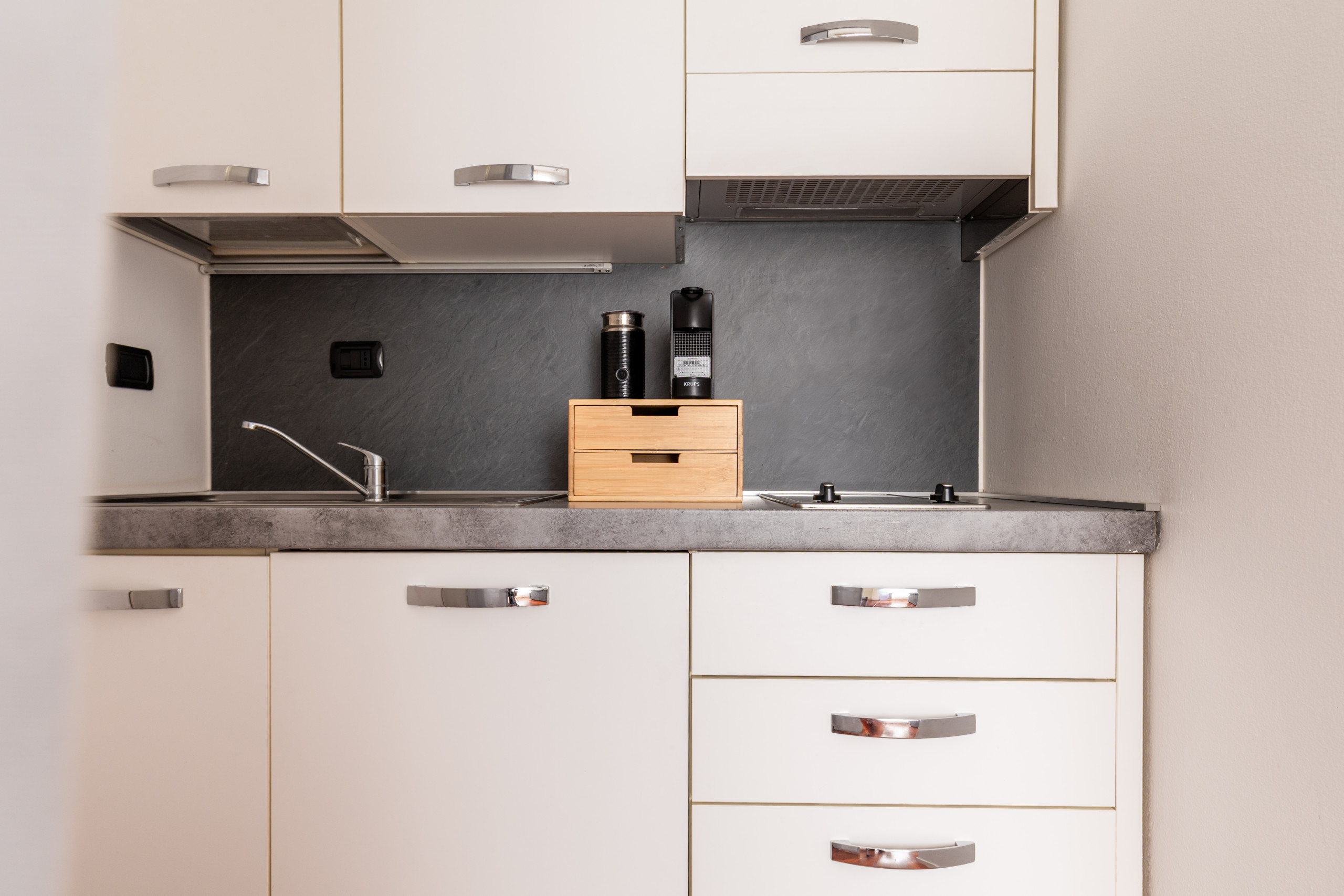 Functional Kitchenette: The kitchen is separate and equipped with everything necessary (refrigerator, microwave, hob, sink, and recycling bins, visible in the photo) to prepare your meals.