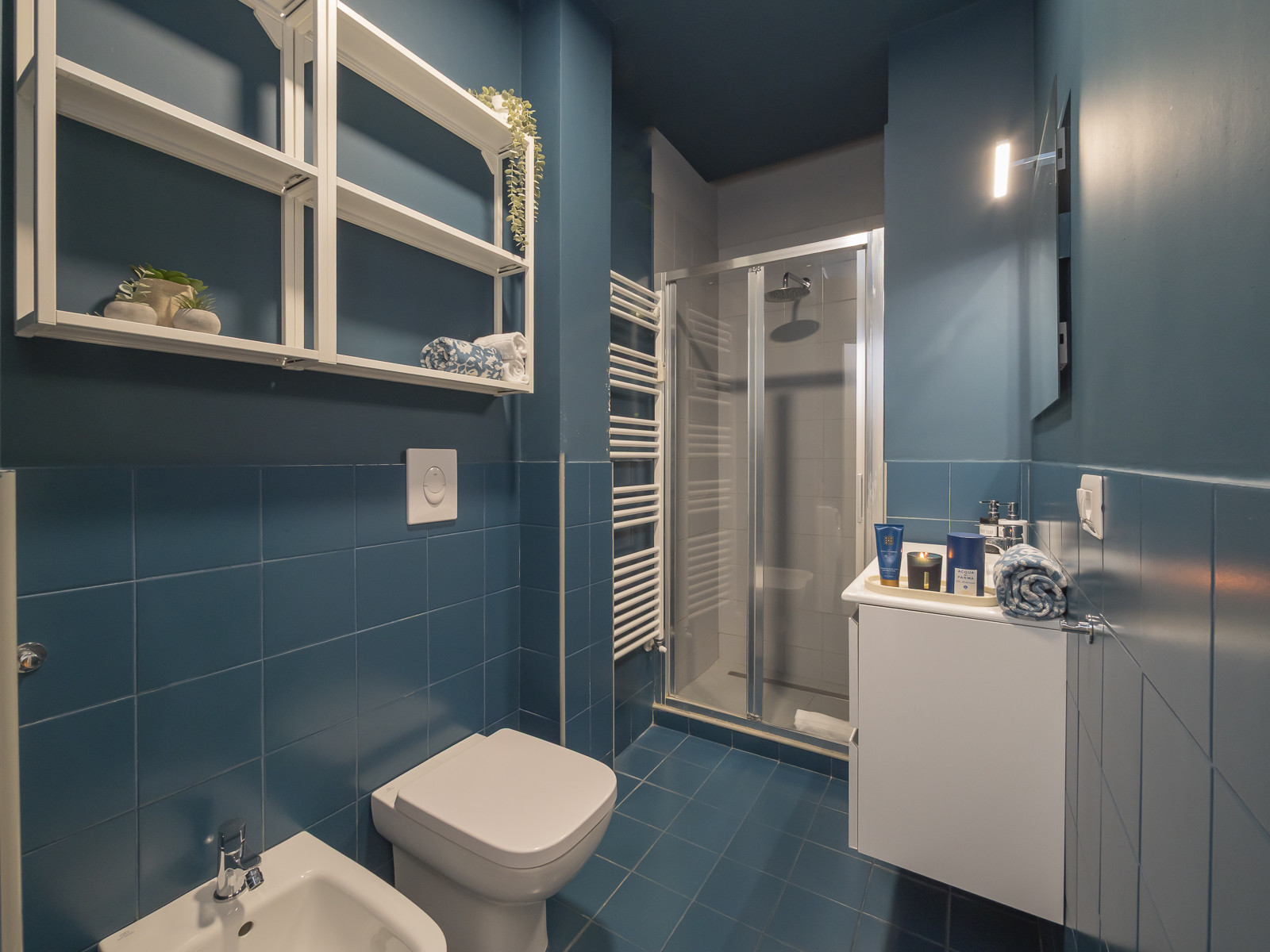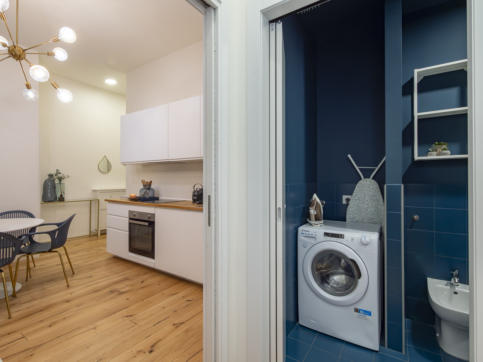 The bright living room is furnished with a sofa that can be converted into a double bed, a table with 4 chairs and a TV. The open kitchen is modern and equipped with a dishwasher, induction hobs and all the utensils for having lunch or dinner for 4 people. The modern furnishings, together with the large windows and the high ceilings typical of period buildings create a unique and refined environment. The bedroom with double bed, TV, wardrobe, also has a small desk where you can work from home in a separate room from the living area. The recently renovated bathroom has a window and it is equipped with a shower cubicle, washing machine and bathroom fixtures.