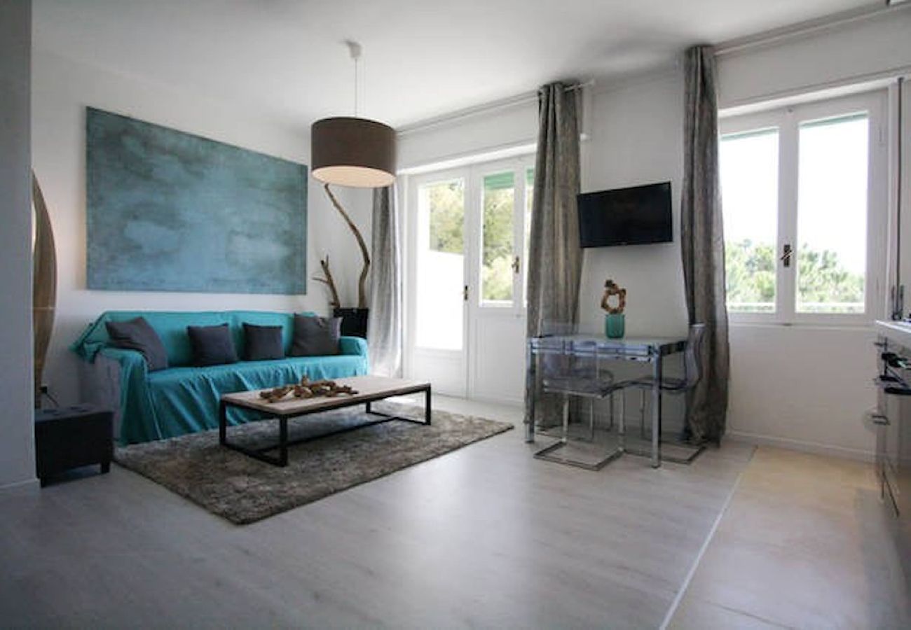 Living area with small terrace overlooking the sea, double sofa-bed and dining table; fully equipped kitchen with oven and dishwasher and breakfast table with stools; bathroom with bath tub and washing machine.